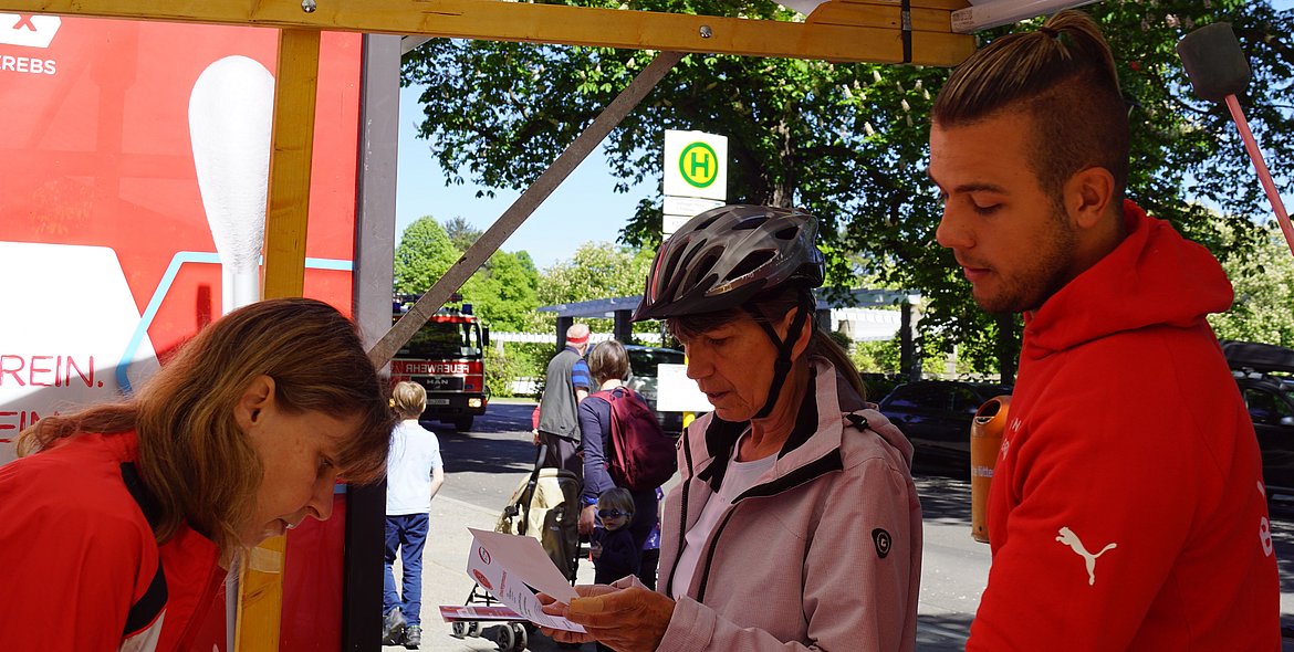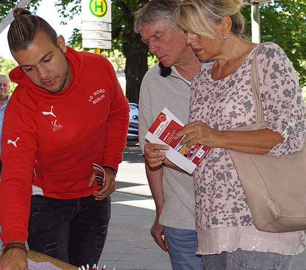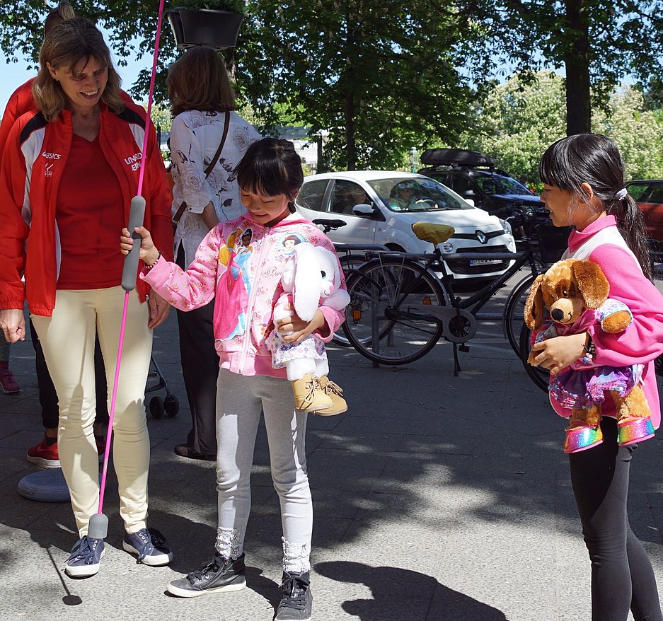 Sportliche Beratung gab es an unserem Vereinsstand. Das Interesse am Sonntag war erfreulich groß. Jung und alt interessierten sich für unsere zahlreichen Angebote im Breitensport und Gesundheitssport und probierten den Umgang mit Flexibar und Balance-Kissen aus. Unsere Breitensportwartin Heidrun Roggensack beantwortetete geduldig die vielen Fragen und Werbewart Marc Lehmann zusammen mit Sprinter Dennis Lux versorgten die wissbegierigen Besucher mit unseren Flyern. Es war eine runde Sache und ein großer Werbeerfolg für unseren Verein.