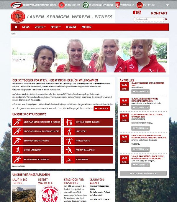 Noch ist hier nicht alles fertig, einige Beiträge, Protokolle, Statistiken, Bilder- und Videogalerien fehlen noch. Wichtig ist aber für uns gewesen, endlich eine klare Trennung zwischen der LG NORD-Homepage, die für den Wettkampfsport der drei Partnervereine steht, und der vereins-internen Website des SCTF mit Infos zum Breitensport, Vereinsstatistik, Vorstandsberichten, Trainingszeiten und -gruppen, sowie Foto- und Videogalerien zu vollziehen.