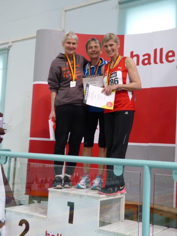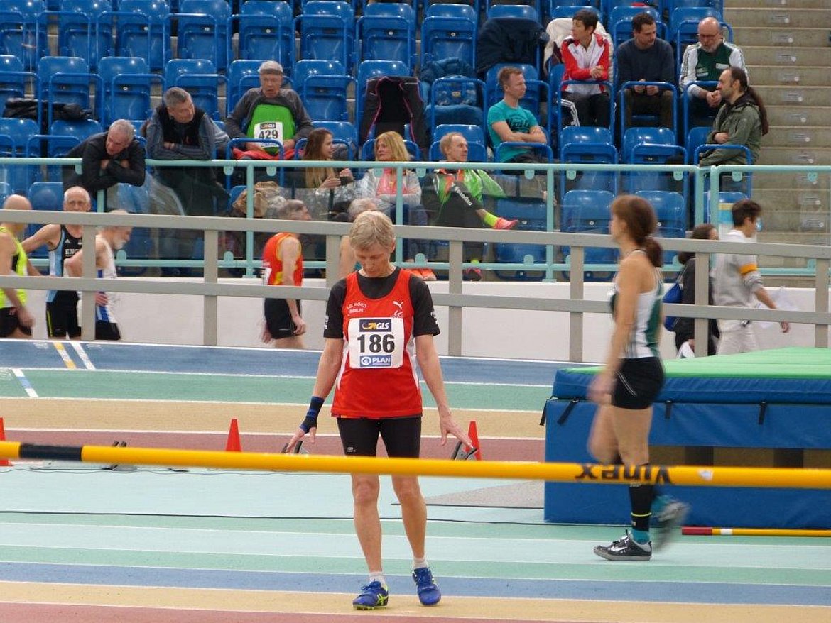 Ulla Schmidt (W65) startete in Halle in unterschiedlichen Disziplinen und konnte Leos Erfolgsserie fortsetzen. So errang sie die Silbermedaille im Hochsprung mit der gleichen Höhe wie die Meisterin und danach am zweiten Tag noch die Bronzemedaille im 60 m Hürdenlauf. Abgerundet wurden diese Ergebnisse noch durch einen 4. Platz beim Weitsprung und einen 6. Platz beim 60m Lauf. Bei beiden Läufen verbesserte sich Ulla deutlich gegenüber dem Ergebnis bei den Berlin-Brandenburgischen Meisterschaften.