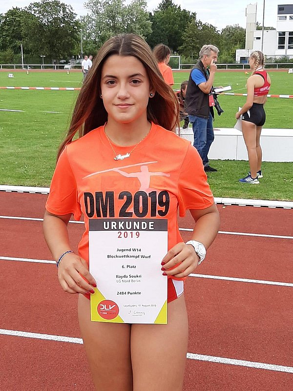Bei der DM in den Blockwettkämpfen der U16 in Lage waren am Samstag zwei Mädels der LG NORD mit dabei. Ilayda Soukri erreichte im Block Wurf (100m, 80m-Hürden, Weit, Kugel und Diskus) bei der W14 mit 2.484 Punkten einen tollen sechsten Platz. Mit Bestleistungen über 80m Hürden in 13.06 sec, im Weitsprung mit 5.07m und beim Kugelstoßen mit 11.10m, lag sie zwischendurch sogar auf einem Medaillenplatz. Auch die 100m waren in 13.47s ein gutes Ergebnis. Leider klappte es im Diskuswurf nicht besonders gut, da auf Grund von Verletzungsproblemen im Vorfeld und Trainingsrückstand zunächst zwei Würfe im Netz landeten und der dritte "nur" 18.60m weit war.