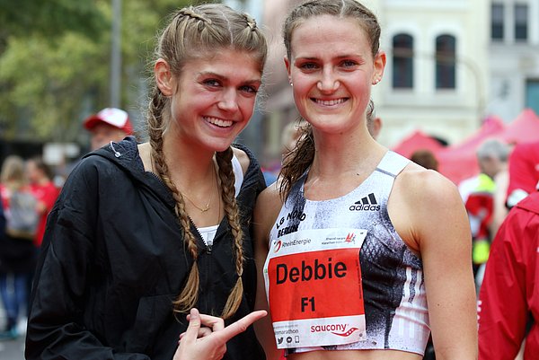 Nur zwei deutsche Frauen waren in Köln jemals schneller. 2006 lief Luminita Zaituc 2:28.30h und 2007 siegte Sabrina Mockenhaupt in 2:29:23h, dies allein belegt die Extraklasse von Debbies Leistung. Zwischenzeitlich lag Debbie sogar auf einem Kurs in der Näher der Olympianorm von Tokio (2:29:30h). Sie lief die ersten 5km Abschnitte in 17:33min, bis 10km in 17:45min und bis 15km in 17:52min. Auch nach dem Ausscheiden der Tempomacher schaffte sie die 5km von 25km bis 30km noch in 17:55 und steigerte sich bis 35km sogar auf 17:26min. Doch dann kam bei ansteigender Wärme von 35km bis 40km der bekannte „Mann mit dem Hammer“ und ein Kilometer-Abschnitt, denn sie alleine gegen den Wind in 19:04min zurücklegen musste und der eine Zeit unter 2:30h kostete. Auf einer schnelleren Strecke mit mehr Tempomachern ist die Olympianorm und die 2:30h-Marke für die Athletin von Jive Müller somit ein realistisches Ziel. Man darf bereits auf das Debüt von Zwillingsschwester Rabea gespannt sein, die heute tatkräftig von der Seite unterstützte.