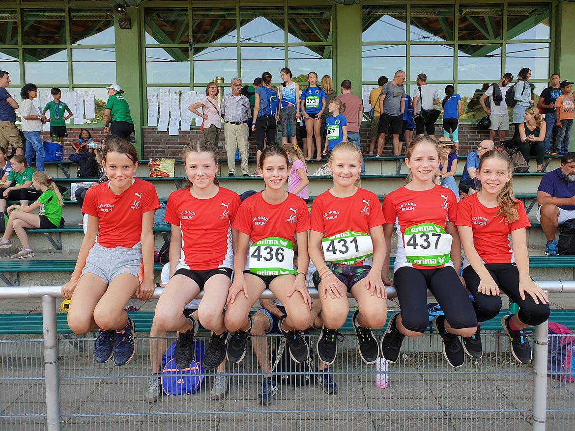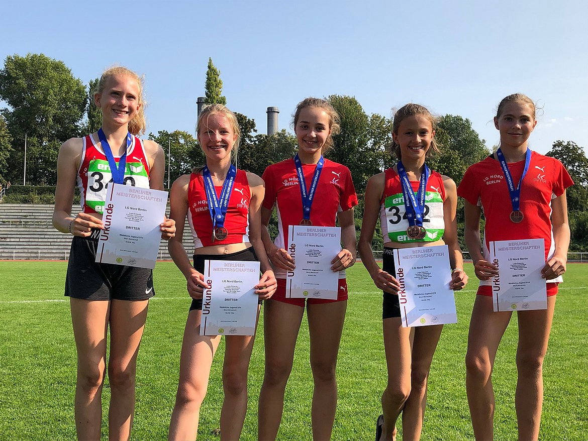 Mit Spannung wurde nach Beendigung der Wettkämpfe auf das Ergebnis in der Mannschaftwertung gewartet. Dritter oder vierter Platz war die viel diskutierte Frage. Die Freude war umso größer, als nach den Sportfreunden Kladow, die Berliner Mannschaftsmeister mit 11.731 Pkt. wurden sowie dem LAC Berlin mit 11.091 Pkt. als Vizemeister, die Mädchen der LG NORD zur Entgegennahme der Bronzemedaille aufgerufen wurden. Mit 10.810 Pkt. konnte der dritte Rang vor dem RSV Eintracht mit 10.580 Pkt. gesichert werden. Den NORD-Mädchen mit Lotta Edzards, Carlotta Loewenthal, Hannah Bischoff, Hannah Suhr (alle SC-TF) und Nina Lüdtke (VfB) darf zu diesem weiteren Erfolg gratuliert werden.