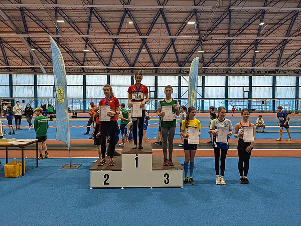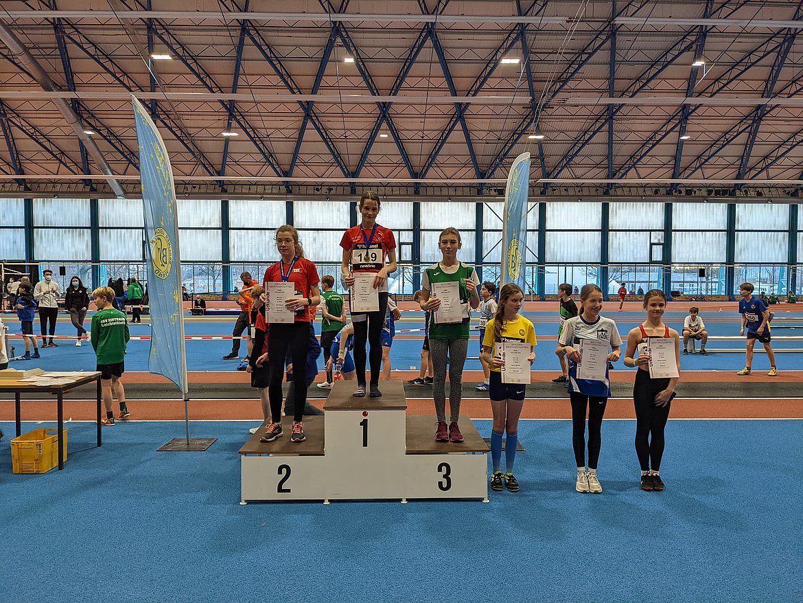 Neben zahlreichen Bestleistungen und vorderen Platzierungen gab es durch Pauline Hochschild die größte und erfreulichste Überraschung. Nach ihrem Vorlaufsieg in 8,79s sprintete sie im A-Endlauf der W12 mit 8,70s zum Sieg und zur Goldmedaille. Mit dieser Zeit hätte sie im älteren Jahrgang der W 13 noch Platz fünf erreicht. Hier siegte Charlotte Maier im B-Finale mit guten 8,90s. Im Hürdensprint über 60m gab es für Charlotte die Bronzemedaille in einer Zeit von 11,20s. Zwar ging sie im schnellen Dreierrhythmus flott über die Hürden, aber an der vorletzten und letzten Hürde strauchelnd, verpasste sie eine deutlich schnellere Zeit. Pauline Wanjura belegte den Platz 9 in 11,93s. Auch Mathilda Jarling kam im Dreierrhythmus durch den „Hürdenwald“ und wurde mit 12,12s letztendlich Elfte.