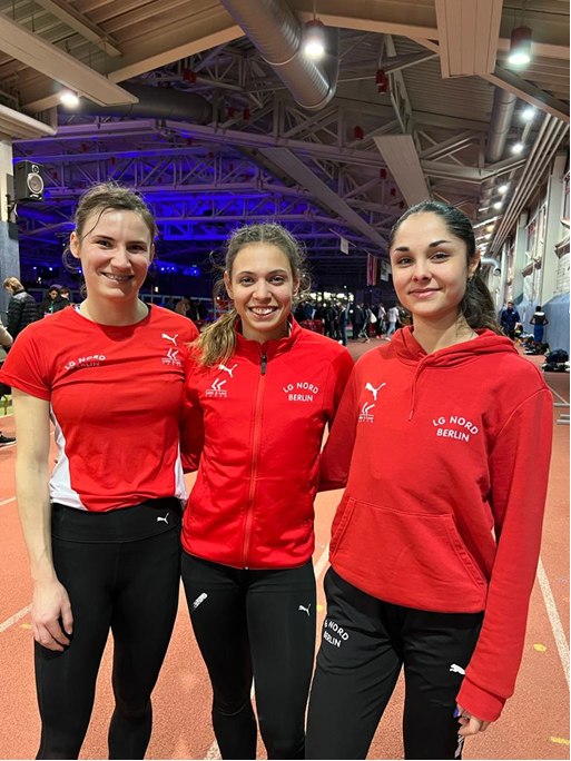 Diese Kulisse beflügelte Caroline Joyeux im 6. Versuch des Dreisprungwettbewerbs. Nach Hop, Step und Jump landete Caroline bei ausgezeichneten 13,77m. Sie stellte damit einen neuen LG NORD Hallen- Rekord auf, egalisierte ihre Bestweite aus der letzten Saison und katapultierte sich an die Spitze der Deutschen Hallenbestenliste. Im Klassefeld der Dreispringerinnen wurde sie großartige Zweite. Damit gehört sie zum engsten Favoritenkreis für die Deutschen Hallenmeisterschaften.