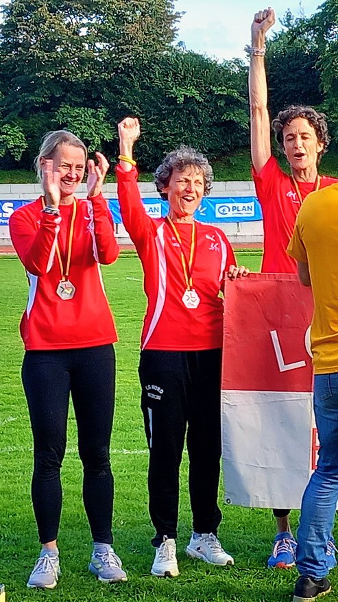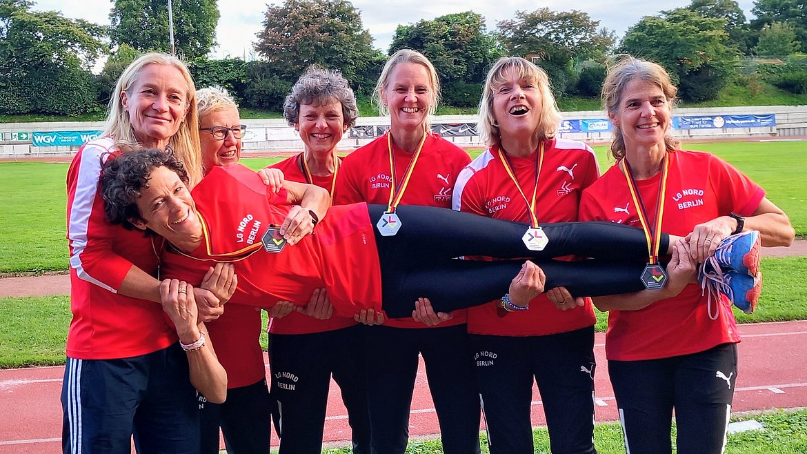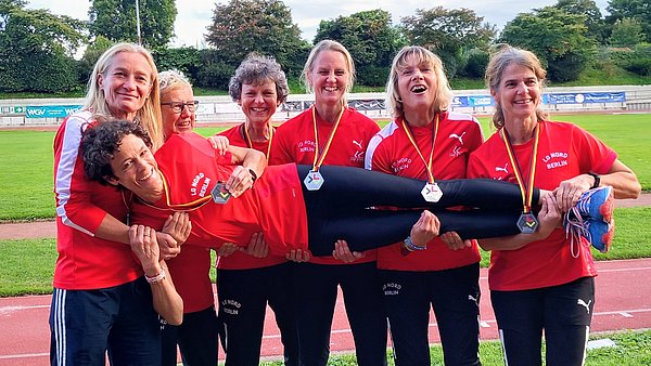 Allen voran sind Caroline Loewenthal und Tina Schulz zu erwähnen. Letztere war unsere beste Punktsammlerin; sie blieb im Sprint nur 7/100 über ihrer am Mittwoch zuvor in Lichterfelde erzielten Bestleistung von 14,19 und steigerte sich mit der Kugel und im Weitsprung - hier auf für sie tolle 4,52m. Caro topte diese Weite noch deutlich mit neuem Berliner Altersklassenrekord von 5,02m im 4. Versuch - ein optimaler Sprung nach zwei Anlaufkorrekturen. Erstmals im Einsatz für uns und gleich in der Wertung war Katja Schmitt im Sprint und als Startläuferin der wieder sehr schnellen Staffel (nur 1/10 über dem vorjährigen Berliner Rekord). Karena Liebenow und Heike Hesse trugen mit guten 3000m-Zeiten zum Erfolg bei.
