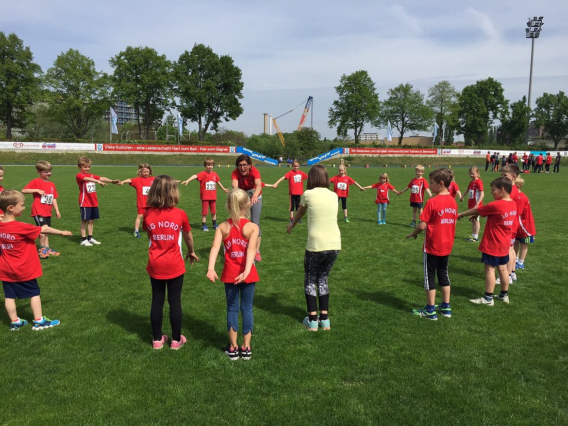 Der Ausrichter, die LG Süd hatte den ganzen Tag alles im Griff und bereitete den Kindern einen perfekten Wettkampftag. Unter ihnen weilten auch drei Mannschaften der LG NORD Berlin. Am besten präsentierten sich dabei unter 8 Mannschaften die Nordmännchen der U8, die in einem spannenden Wettkampf hinter den Superblauen aus Hohen Neuendorf und den Sporthasen aus Lichtenrade den 3. Platz belegten. Mit 2x30 m, Zielweitsprung, Schlagwurf und einem Hindernis-Staffel-Rennen waren die „kleinen“ der U8 mit Feuereifer dabei.