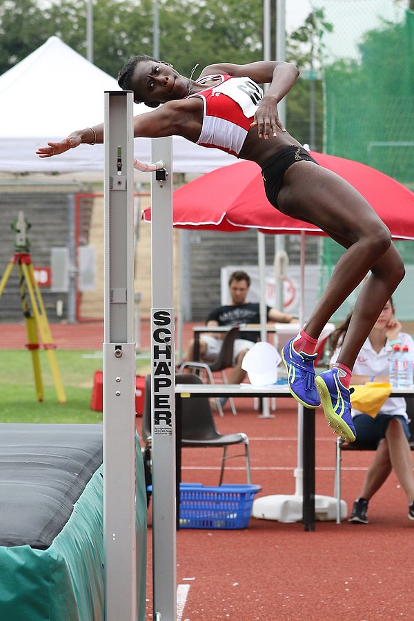 Kaum war Cati im Ziel, folgte die zweite Goldmedaille durch Jossie Graumann im Hochsprung. Nachdem sie alle Höhen von 1,74m bis 1,84m im ersten Versuch nahm, waren nur noch zwei Springerinnen im Wettbewerb. Im Gegensatz zu Anne Klebsch von der TG Ötigheim, die bereits zwei Fehlversuche gesammelt hatte, meisterte Jossie die 1,87m dann im dritten Versuch und sicherte sich mit der Einstellung ihrer erst wenige Wochen alten Bestleistung ihren ersten Deutschen Meistertitel.